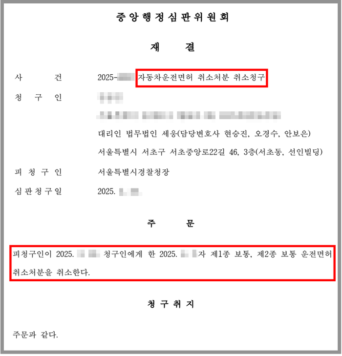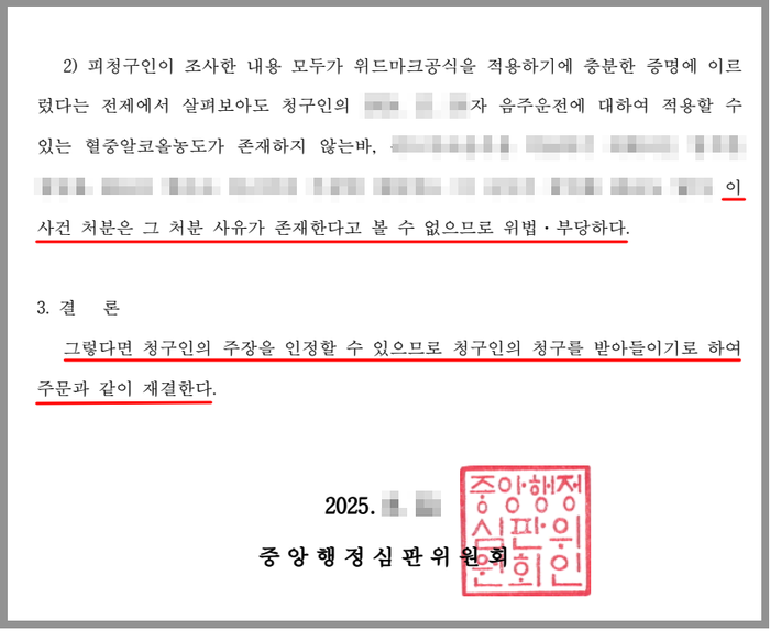 이와 같이 효과적인 대응을 한 덕분에 중앙행정심판위원회는 서울특별시경찰청장이 A에 대하여 한 운전면허취소처분을 취소한다는 결정을 하였습니다.