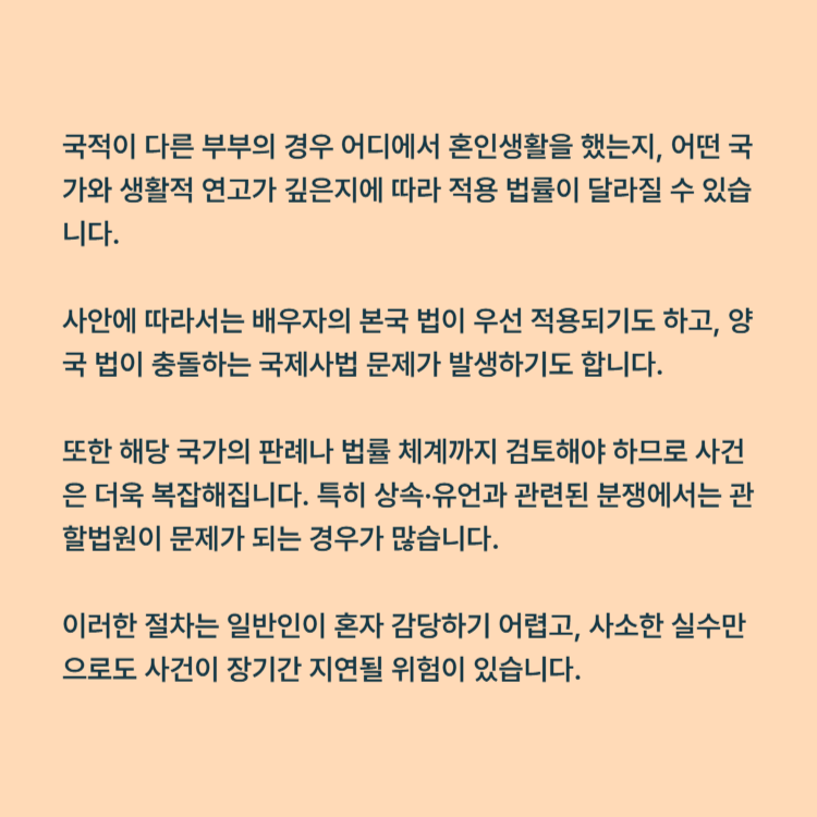특히 상속·유언과 관련된 분쟁에서는 관할법원이 문제가 되는 경우가 많습니다. 어떤 경우에는 한국 법원이 아닌, 배우자 국적 국가의 법원에 청구를 해야 하는 상황까지 발생할 수 있습니다. 이러한 절차는 일반인이 혼자 감당하기 어렵고, 사소한 실수만으로도 사건이 장기간 지연될 위험이 있습니다.