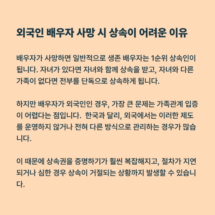 하지만 배우자가 외국인인 경우, 가장 큰 문제는 가족관계 입증이 어렵다는 점입니다. 한국에서는 가족관계증명서를 통해 친족관계를 쉽게 확인할 수 있지만, 외국에서는 이러한 제도를 운영하지 않거나 전혀 다른 방식으로 관리하는 경우가 많습니다. 이 때문에 상속권을 증명하기가 훨씬 복잡해지고, 절차가 지연되거나 심한 경우 상속이 거절되는 상황까지 발생할 수 있습니다.