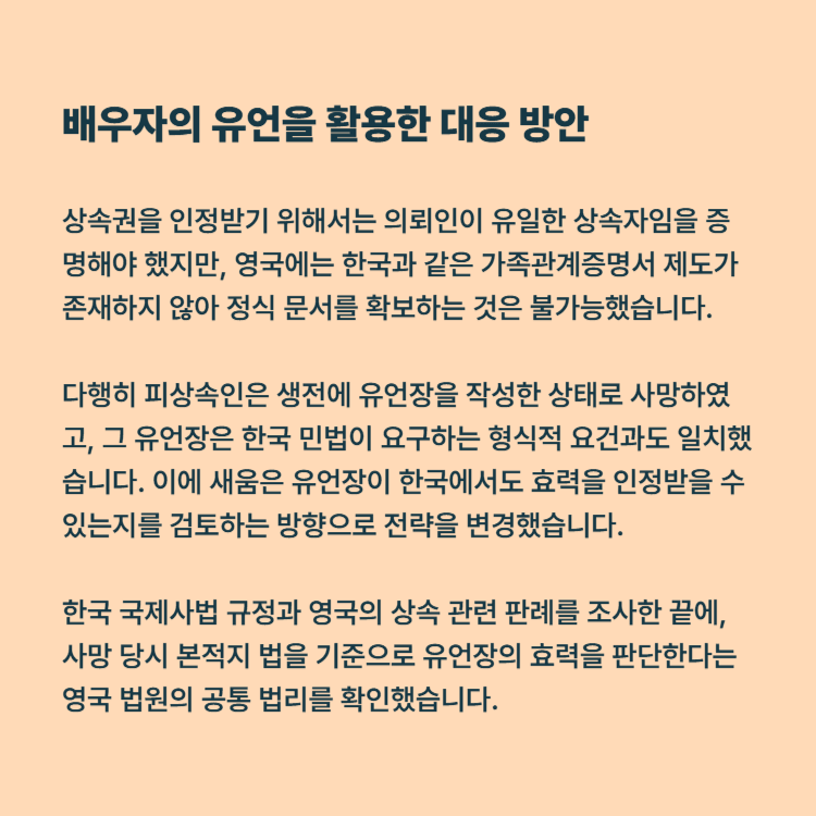 새움은 한국 국제사법 규정과 영국의 상속 관련 판례를 모두 조사하여, 사망 당시 본적지 법을 기준으로 유언장의 효력을 판단한다는 영국 법원의 공통 법리를 확인했습니다. 이를 바탕으로 “영국인이라 하더라도 국내에서 작성한 유언장은 한국 민법의 적용을 받으며, 그에 따라 국내에서 효력이 발생한다”는 법리를 정리해 법원에 제출했습니다.