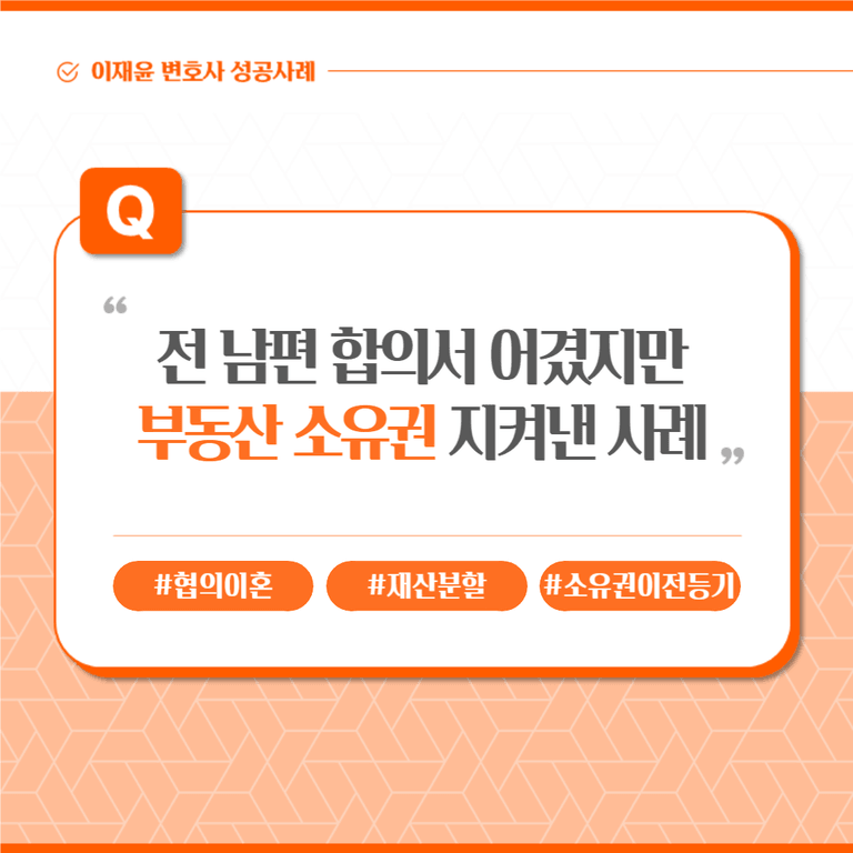 그러나 합의서의 핵심 내용이 ‘이 사건 부동산을 의뢰인 명의로 이전한다’는 점이었으므로, 의뢰인은 재산분할을 원인으로 한 소유권이전등기 청구 소송을 제기하였습니다.