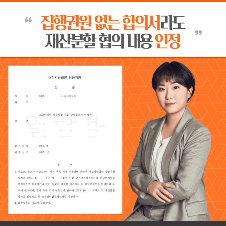 집행권원이 없는 단순 합의서라 하더라도, 그 내용이 재산분할 협의로서 유효하다면 소송을 통해 강제이행이 가능합니다.