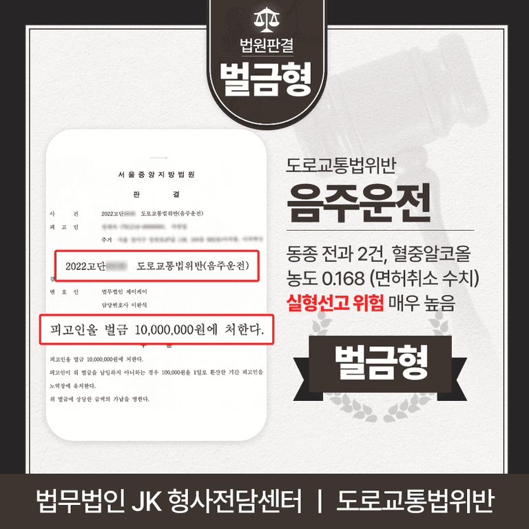 오늘은 혈중알코올농도 0.168, 과거 음주운전 전력 2회가 있었던 사건에서 법무법인 JK 형사전담센터의 전략적 대응을 통해 실형 위험을 벗어나 벌금형을 이끌어낸 사례를 소개합니다.