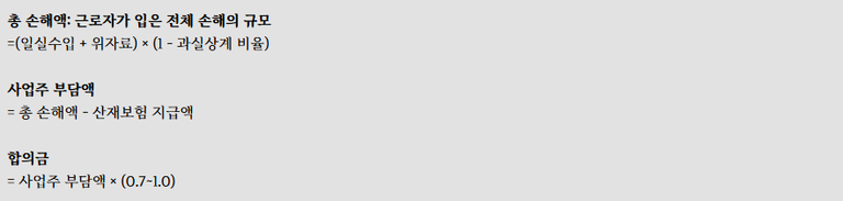 통상적으로 산업재해가 발생한 경우, 손해배상과 관련된 금액은 아래와 같은 법률적 구조에 따라 산정됩니다.