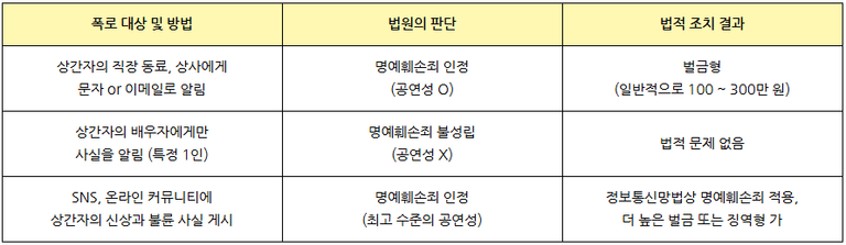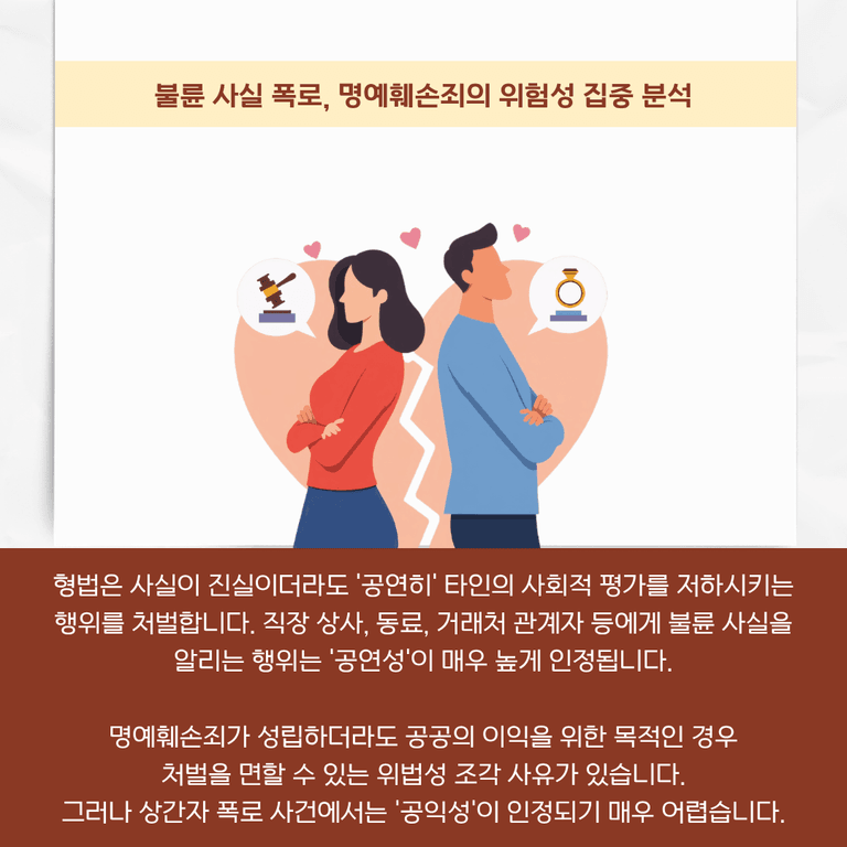 하지만 감정적인 폭로는 예상치 못한 형사상 명예훼손죄라는 법적 위험을 초래할 수 있습니다.