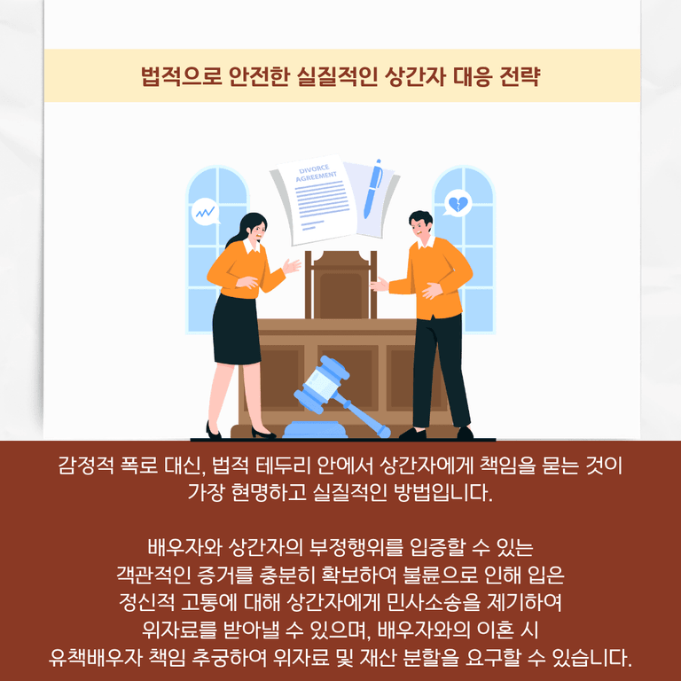 감정적 폭로 대신, 법적 테두리 안에서 상간자에게 책임을 묻는 것이 가장 현명하고 실질적인 방법입니다.