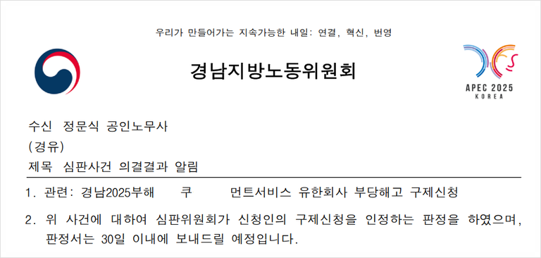노동자의 부당해고 구제신청 사건을 진행하여 부당해고로 ‘인정’된다는 판정을 받았습니다.