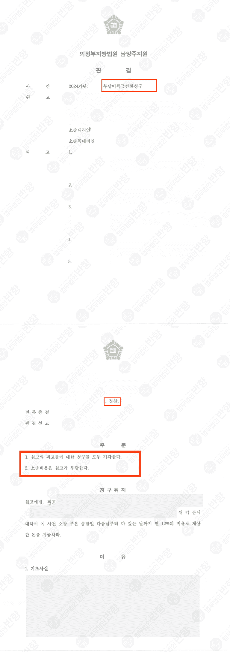의정부지방법원은 선고에서 피고 전원 승소(원고 청구 전부 기각) 판결을 내렸습니다.