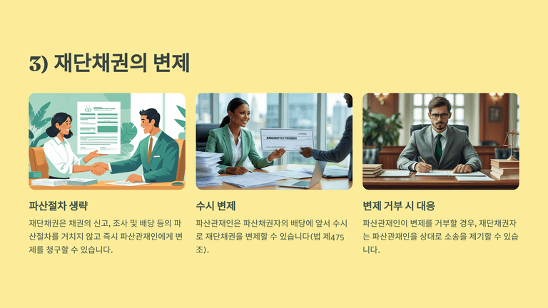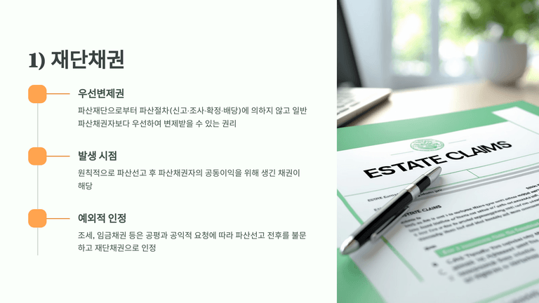 재단채권은 파산절차의 신고·조사·확정·배당 절차를 거치지 않고 파산재단에서 일반 파산채권자보다 우선하여 변제받는 채권을 말하며, 법 제473조의 일반재단채권과 다른 조문에서 규정한 특별재단채권으로 구성된다.