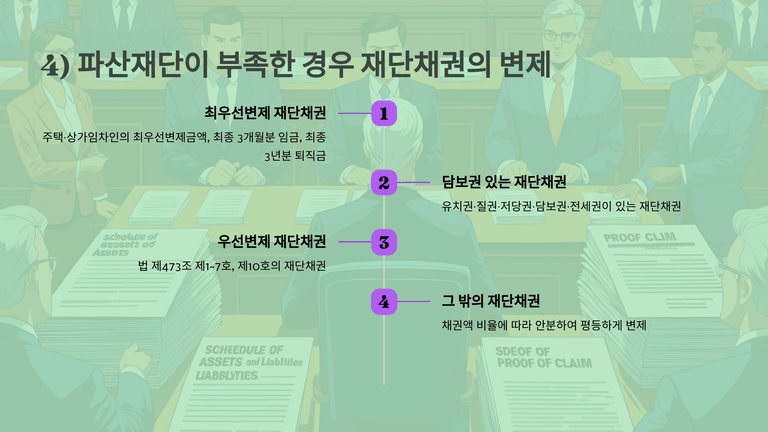파산재단이 부족한 경우 최우선 임차보증금·임금·퇴직금이 최우선적으로 변제되고, 그다음 유치권·질권·저당권 등 담보권이 인정된다. 이후 제473조 제1~7호·10호의 우선재단채권이 변제되며, 마지막으로 ‘그 밖의 재단채권’이 변제된다. 이들 사이에서는 다른 법령상의 우선권에 불구하고 남은 채권액 비율에 따라 안분하여 변제가 이루어진다(법 제477조).