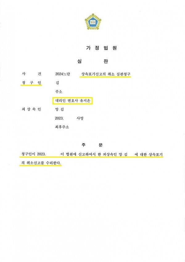 상속포기가 수리된 이후 이를 취소하는 것은 매우 힘든 사안이었음에도 불구하고 이미 상속포기된 것을 취소할 수 있었으며, 이에 의뢰인은 상속인의 자격을 회복하여 성공적으로 상속을 받을 수 있었습니다.