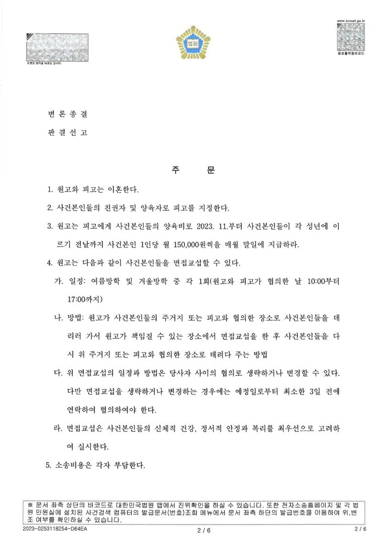 법원은 이혼 인용, 의뢰인의 의사에 따라 자녀의 친권·양육권 모두 상대방에게 귀속되었고, 의뢰인은 월 15만 원의 양육비만을 지급하게되었고, 면접교섭을 인정받았습니다.