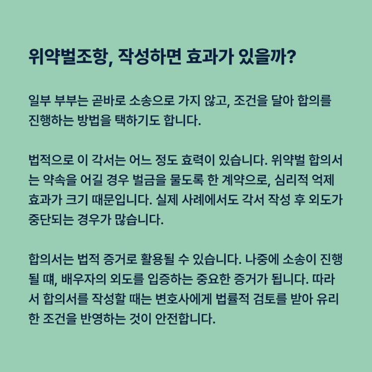또한, 합의서 작성 사실은 법적 증거로 활용될 수 있습니다. 나중에 소송이나 법적 절차가 진행될 경우, 배우자의 외도를 입증하는 중요한 단서가 됩니다. 따라서 합의서를 작성할 때는 사전에 변호사와 협상하고, 법률적 검토를 받아 유리한 조건을 반영하는 것이 안전합니다.