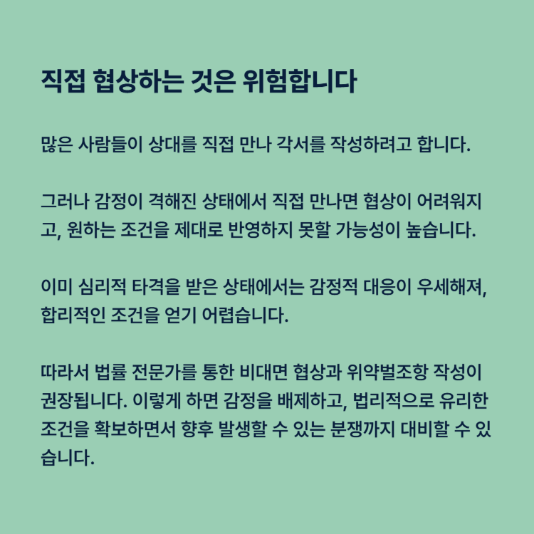 많은 사람들이 상대를 직접 만나 각서를 작성하려고 합니다. 그러나 감정이 격해진 상태에서 직접 만나면 협상이 어려워지고, 원하는 조건을 제대로 반영하지 못할 가능성이 높습니다. 이미 심리적 타격을 받은 상태에서는 감정적 대응이 우세해져, 합리적인 조건을 얻기 어렵습니다.