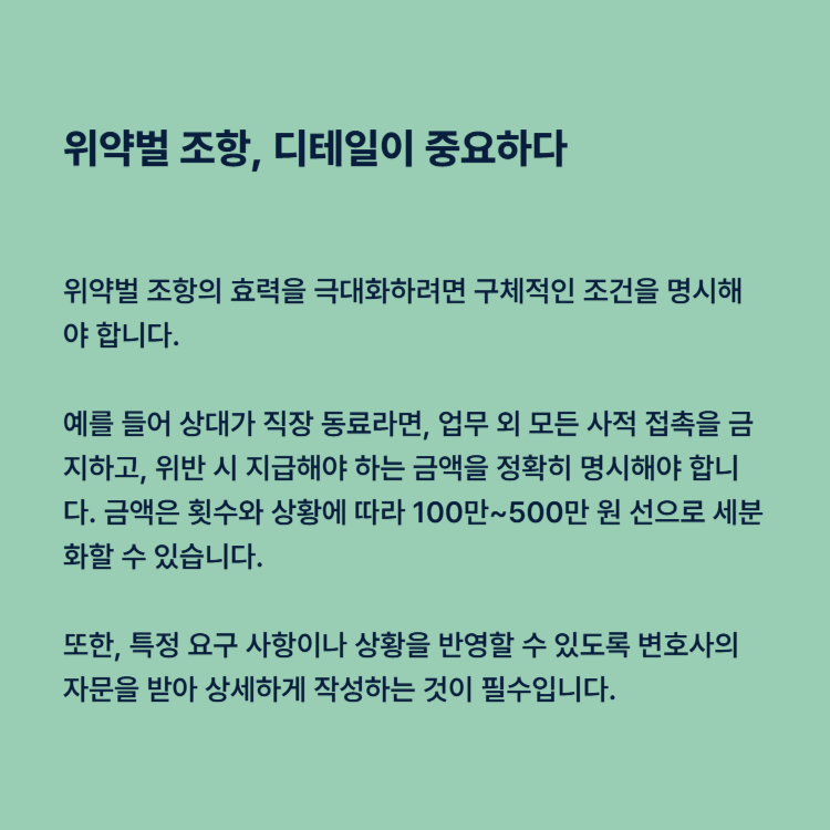 위약벌 조항의 효력을 극대화하려면 구체적인 조건을 명시해야 합니다. 예를 들어 상대가 직장 동료라면, 업무 외 모든 사적 접촉을 금지하고, 위반 시 지급해야 하는 금액을 정확히 명시해야 합니다. 금액은 횟수와 상황에 따라 100만~500만 원 선으로 세분화할 수 있습니다.