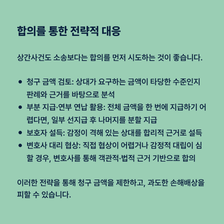 이러한 전략을 통해 청구 금액을 제한하고, 과도한 손해배상을 피할 수 있습니다. 상대가 합의를 거부하면 소송으로 진행할 수 있지만, 사전 전략을 세워두면 법정에서도 유리한 조건을 확보할 수 있습니다.