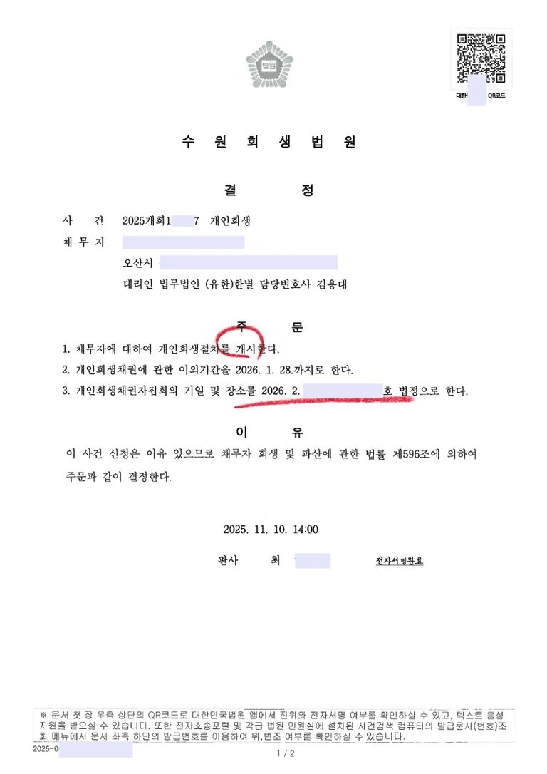 원리금 약 1억 5천만원 중, 원금의 37%변제로 개시결정 되었습니다.