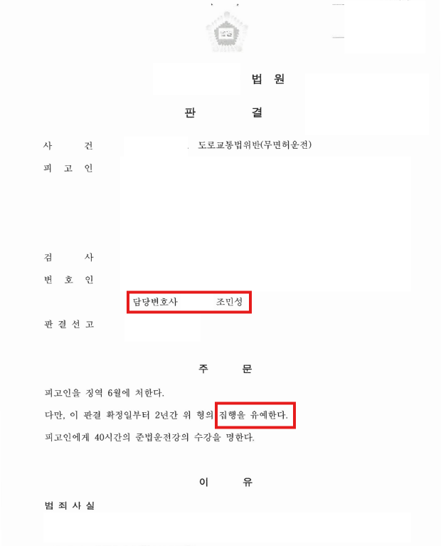 ■ 결론적으로, 전력 다수라는 불리함을 상쇄하기 위해 ‘유사 판결 데이터’와 ‘행동 변화 증거’를 결합한 방식을 끝까지 유지했습니다. 그 결과 재판부는 불리한 정상에도 불구하고 집행유예를 선택했고, 준법운전 강의 이수 명령으로 교정적 목적을 달성하는 선에서 사건이 마무리되었습니다.
