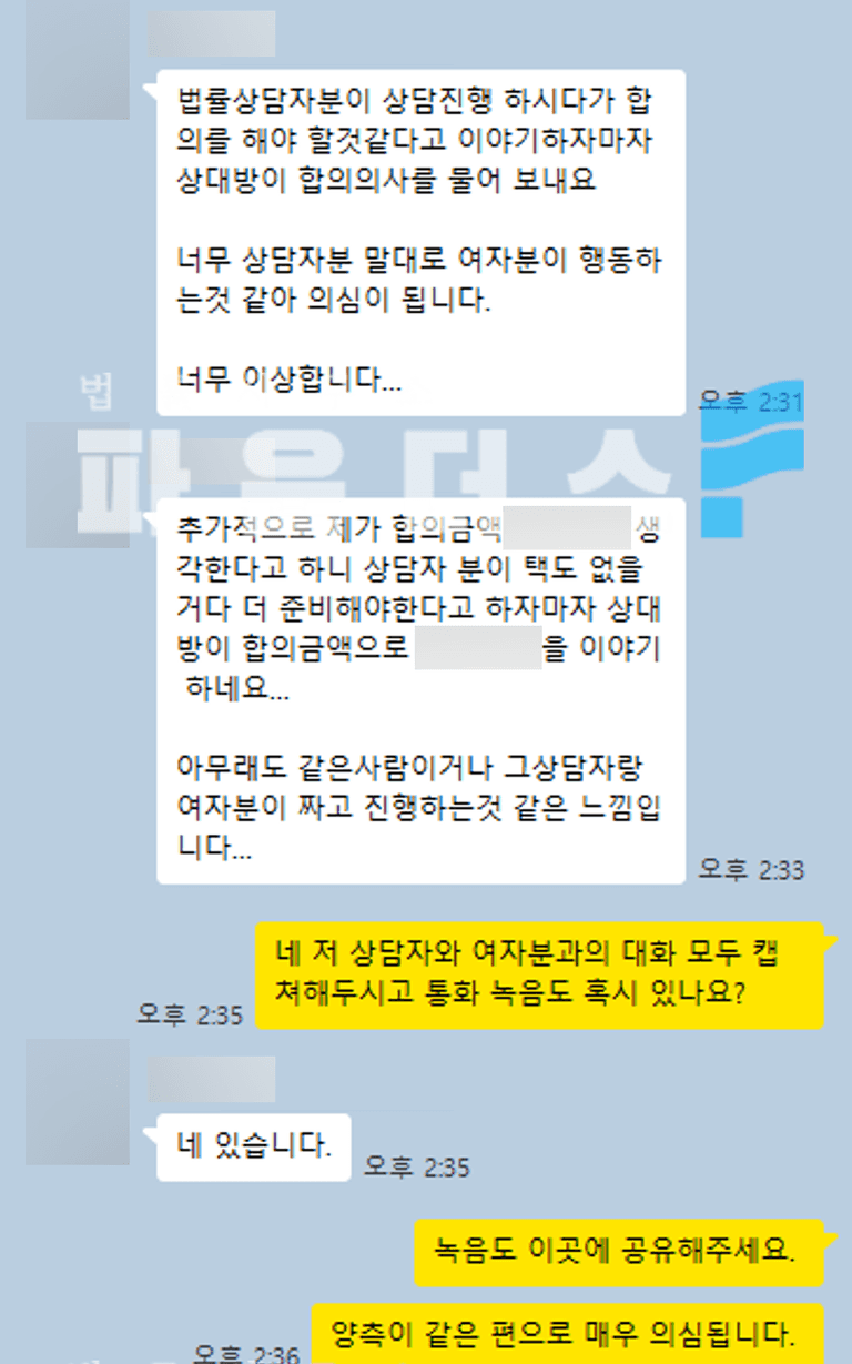 변호사가 아닌 자가 법률 상담을 진행하는 것은 명백히 변호사법 위반에 해당하며 일부는 헌터와 공모하는 경우가 존재하기에 특히 주의하셔야 합니다. 파운더스는 이러한 변호사법 위반 사례에 대하여 적극적인 모니터링 후 향후 형사고발을 고려중입니다.