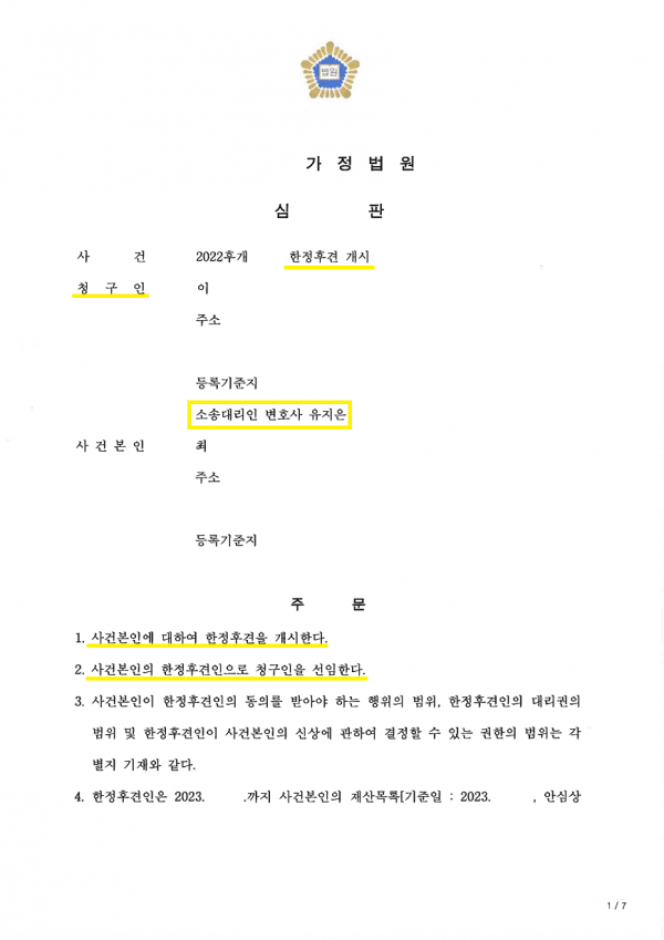 결국, 아내의 정신감정 거부 및 반대 의사에도 불구하고 아내의 한정후견이 개시되었으며, 한정후견인으로 의뢰인이 선임되며 성공적으로 마무리한 사안입니다.