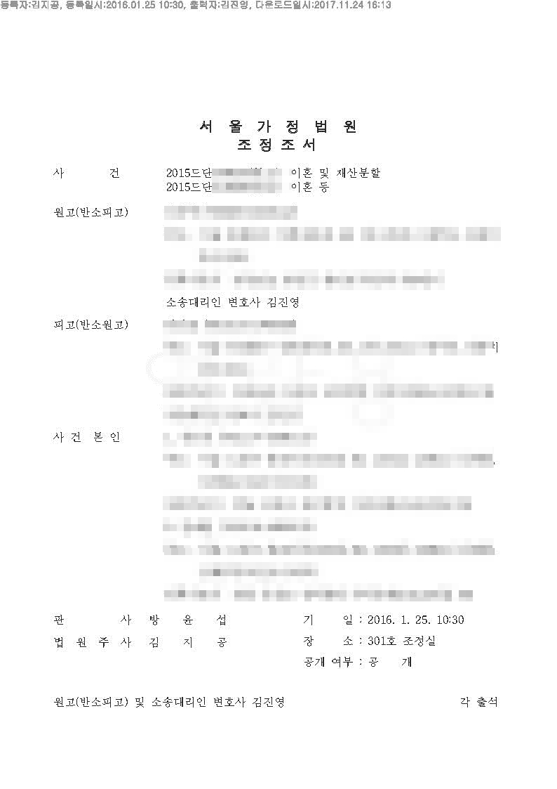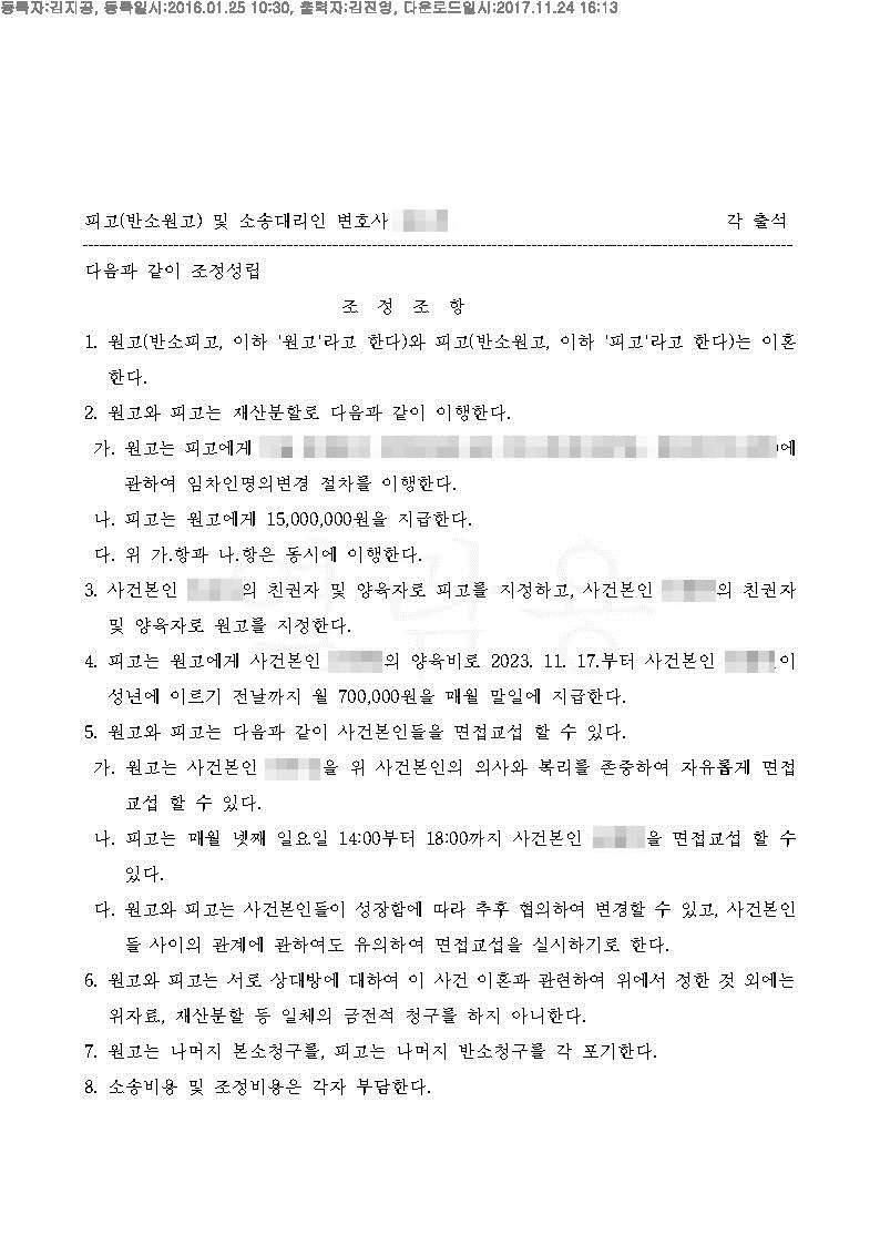 결과 : 저희 법률사무소에서 소송을 진행하였으며 법원에서 조정에 회부하였으며, 저희 대표변호사인 김진영변호사님께서 조정을 잘 이끌어 내어 위자료로 1,500만원을 지급 받으실수 있었습니다. 그러나 따로 재산분할 대상이 존재하지 않아 재산분할을 실행할수 없었던 사건이었습니다. 또한 자녀의 양육권은 원고와 피고가 각각 한명씩을 양육하기로 조정한 사건입니다.