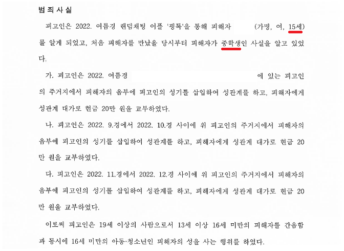 A씨는 2022. 여름경 랜덤 채팅 어플리케이션 '핑톡'에서 알게 된 15세 중학생 B양과 총 3회에 걸쳐 조건만남을 하였습니다.