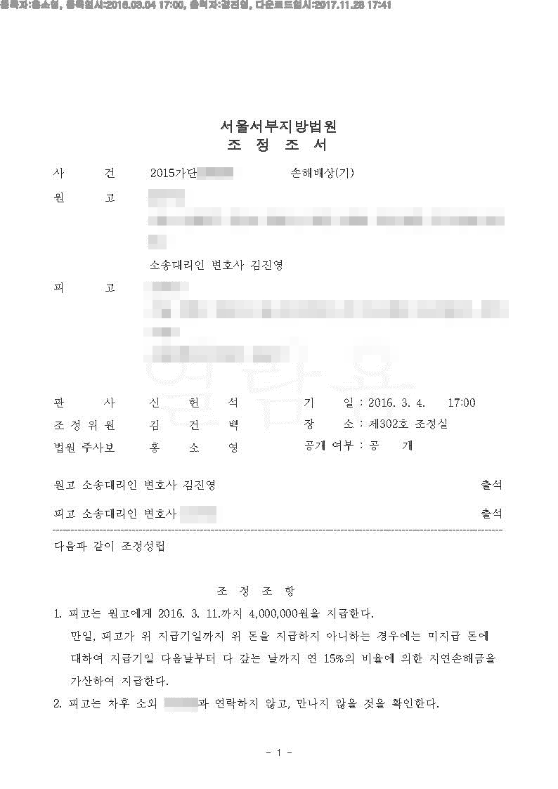 결과 : 저희 법률사무소에서 소송을 진행하였으며 법원에서 조정에 회부하였으며, 의뢰인께서 높은 손해배상금 보다 조정에 원하시는 문구를 기재하는 조건(남편과 연락하지 않고 만나지 않는다는 내용)으로 금액이 비교적 적은 400만원의 손해배상금을 지급받을 수 있었습니다.