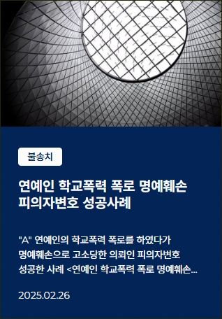 ![[명예훼손/모욕]리뷰명예훼손? 완벽히 억울함 풀은 사례#명예훼손](/_next/image?url=https%3A%2F%2Fd2ai3ajp99ywjy.cloudfront.net%2Fuploads%2Ftitleimage%2Foriginal%2F5b4f13aaf65d10a5d4bcb0ba-original.jpg&w=3840&q=75)