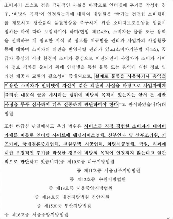 이 점을 근거로, 의뢰인분의 후기 작성 행위는 예비 소비자들의 공공의 이익을 위하여 작성된 것이기 때문에 비방의 목적이 인정되지 않는다는 점을 강조하였습니다.더욱이, 유사한 사안에서 비방의 목적이 부정되고 공공의 이익이 인정된 다수의 하급심 판례를 적극적으로 인용함으로써, 저희 주장의 신뢰성을 한층 더 강화하였습니다.
