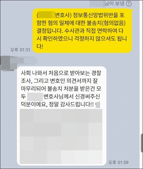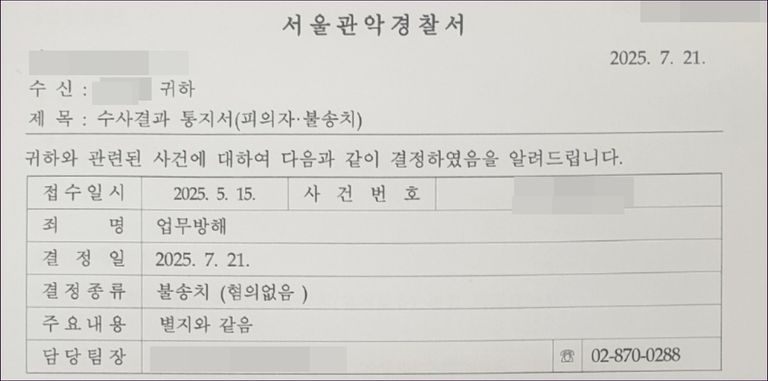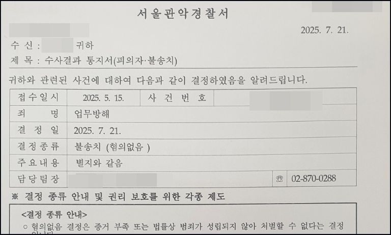 결과는 기대 이상으로 신속했습니다. 피의자 조사를 받은 지 약 2주 만에, 경찰은 저희의 주장을 모두 받아들여 두 가지 혐의에 대해 모두 '혐의없음'으로 불송치 결정을 내렸습니다.