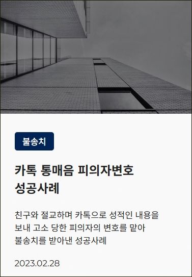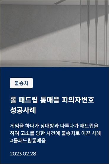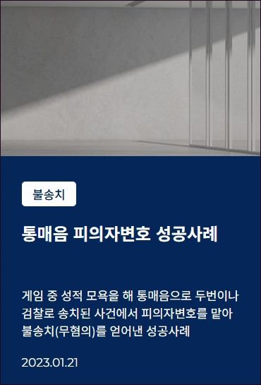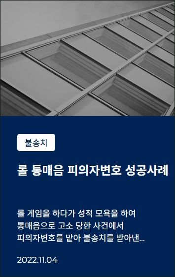 ![[디지털성범죄] 롤통매음 고소, 불송치로 완벽 방어#통매음](/_next/image?url=https%3A%2F%2Fd2ai3ajp99ywjy.cloudfront.net%2Fuploads%2Ftitleimage%2Foriginal%2F5c8d2905dba534c9c7d8de9a-original.jpg&w=3840&q=75)
