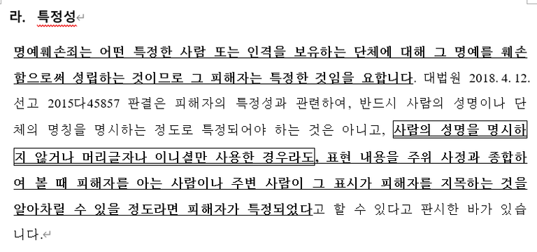 이번 사건에서 가장 중점적으로 염두에 두었던 것은특정성이 성립한다는 점이었습니다. 많은 분들께서 아시다시피 명예훼손, 모욕의 죄가 성립하기 위하여는, 피해자를 특정하는 특정성요건이 성립되어야 하는데요 그런데 이 사건의 경우 상대방이 자신은 피해자(저희 의뢰인 분)의 실명을 밝히지 않았으므로, 특정성이 없다라고 주장할 것이 충분히 예상된 상황이었습니다.