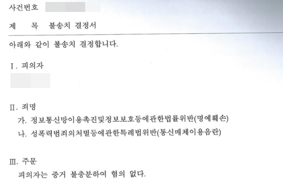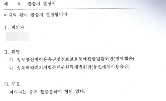 결과: 정보통신망법위반(명예훼손) 및 성폭력처벌법위반(통매음) 모두 혐의없음(불송치)