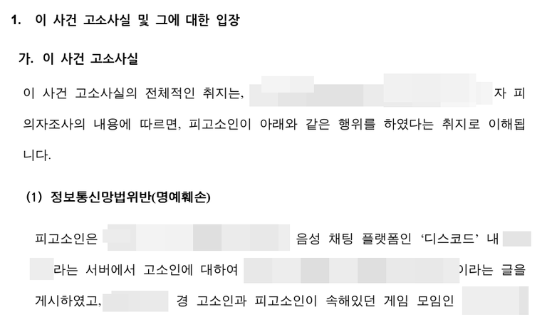 고소인은 의뢰인을 두 가지 혐의로 동시 고소하였습니다. 첫째는 의뢰인이 디스코드 클랜 채널에서 고소인의 사적 비밀(과거의 아픔)을 누설했다는 명예훼손 혐의였고, 둘째는 게임과 디스코드에서 성적인 농담을 했다는 통매음 혐의였습니다.