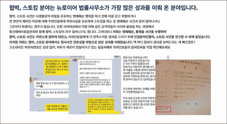 저희 뉴로이어는 '새로운 시대를 위한 새로운 로펌'으로서, 온라인 플랫폼에서 발생하는 신종 분쟁 해결에 앞장서고 있습니다. 그중에서도 익명성을 방패 삼아 벌어지는 협박, 스토킹, 명예훼손, 모욕 범죄에 대해서는 타의 추종을 불허하는 성공 경험을 보유하고 있습니다.