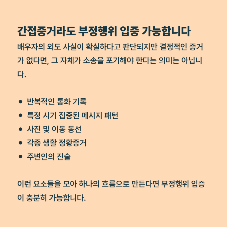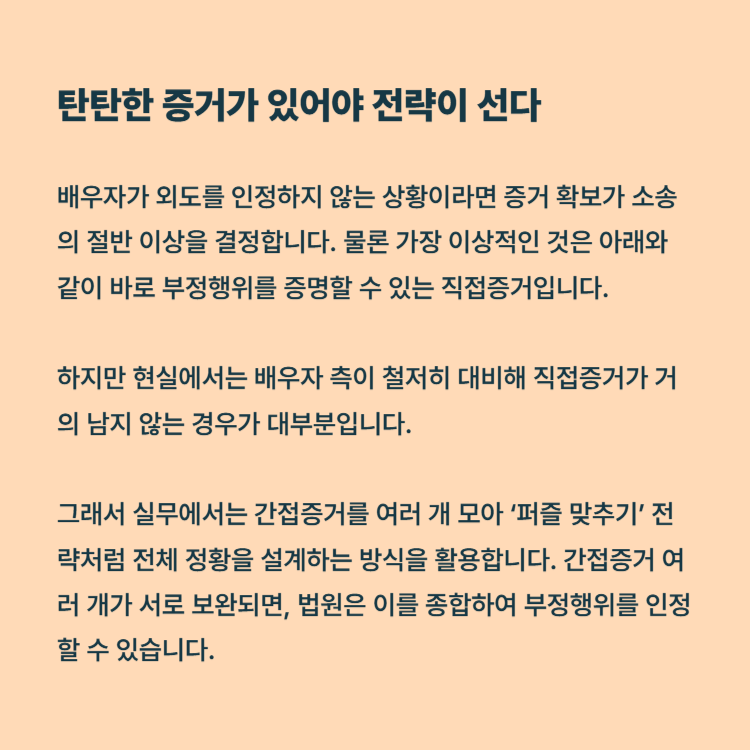 그래서 실무에서는 간접증거를 여러 개 모아 ‘퍼즐 맞추기’ 전략처럼 전체 정황을 설계하는 방식을 활용합니다. 간접증거 여러 개가 서로 보완되면, 법원은 이를 종합하여 부정행위를 인정할 수 있습니다.