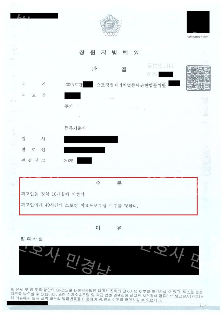 결국 법원은 가해자의 주장을 받아들이지 않고 가해자에게 징역 10개월의 실형을 선고하고, 40시간의 스토킹 치료프로그램 이수를 명령했습니다. 가해자의 뻔뻔한 부인에도 불구하고, 탄탄하게 준비된 증거와 의뢰인의 일관된 진술로 수사기관과 재판부를 설득하여 실형까지 이끌어 낼 수 있었습니다.