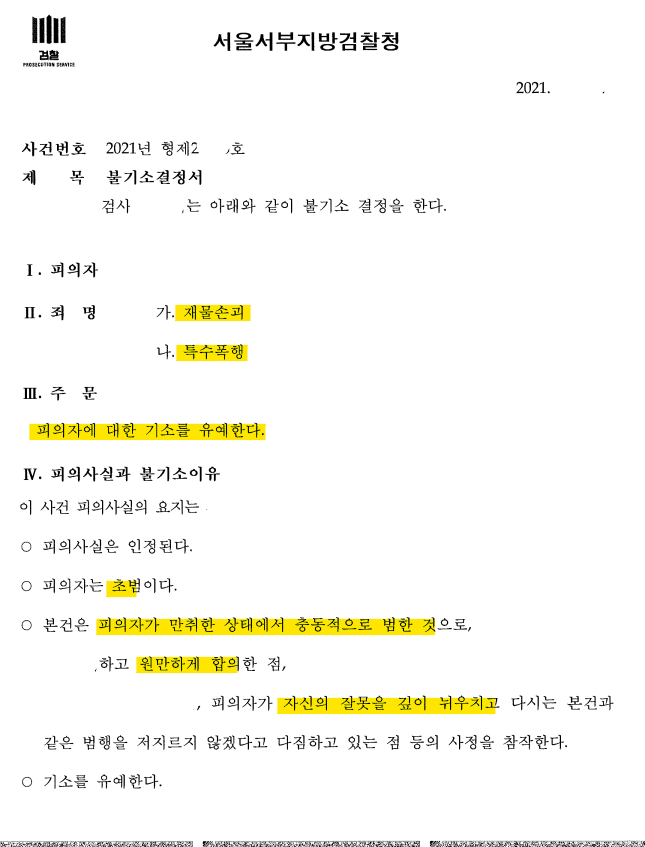 검찰송치 이후 곧바로 기소유예결정으로 종결됨