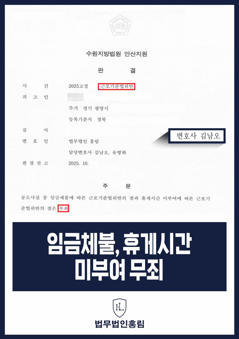 이는 근로기준법 위반 혐의에 대해 사업주가 형사 처벌을 면하고, 부당한 고소로부터 사업의 안정성과 명예를 지켜낸 성공적인 방어 사례로 평가됩니다.