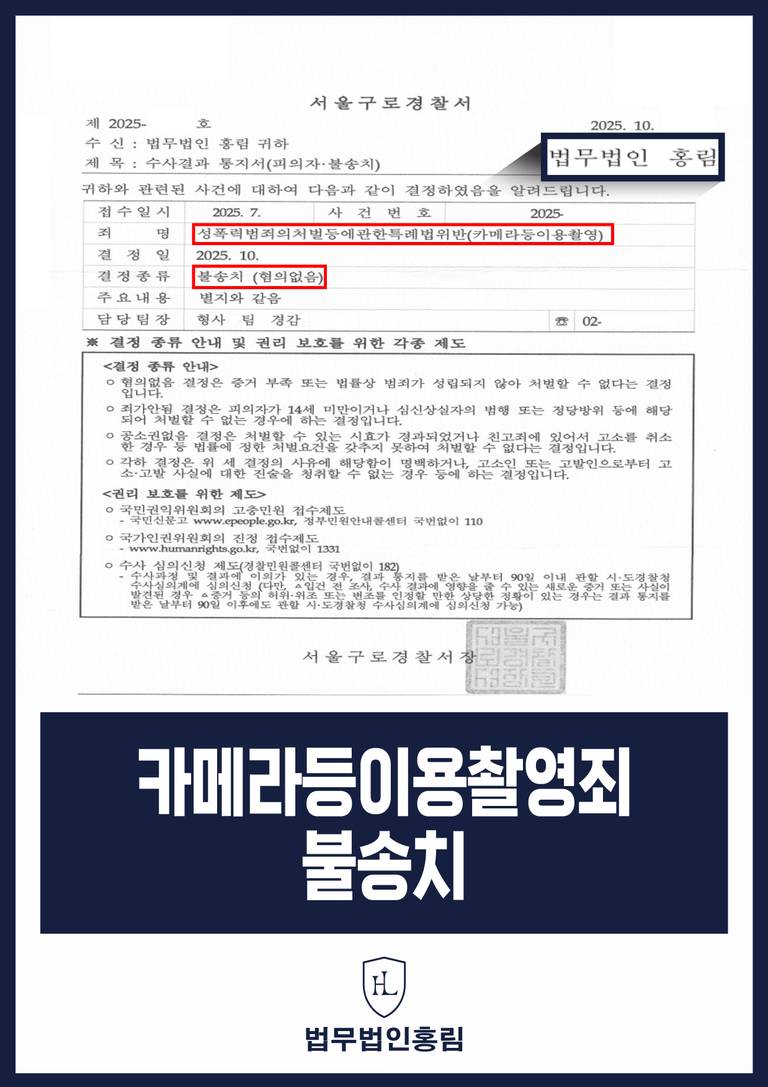 의뢰인은 카메라등이용촬영죄압수수색 이후의 불안감과 억울함에서 벗어나 일상과 생업으로 즉시 복귀할 수 있었습니다.
