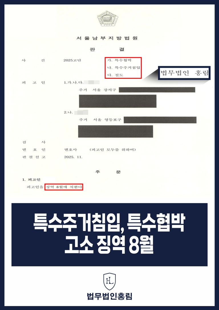 법무법인 홍림의 치밀한 법리 주장과 피해자 변론은 재판부의 판단에 결정적인 영향을 미쳤습니다. 재판부는 변호인단이 주장한 특수협박, 특수주거침입, 절도 혐의를 모두 인정하였습니다.