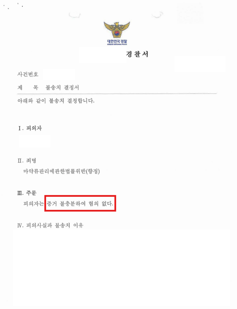 수사기관은 이 사건에 대하여 최종적으로 혐의없음(증거불충분)의 불송치 결정을 내렸습니다.