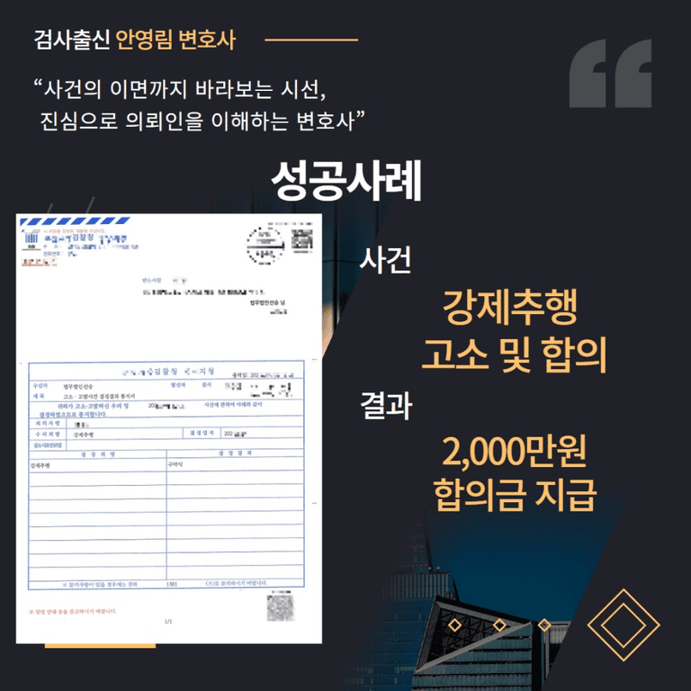 - 수사 과정에서 피의자 측과 합의를 주선하여, 2,000만 원의 합의금을 지급받도록 하여 실질적인 피해 회복을 이끌어냈습니다.