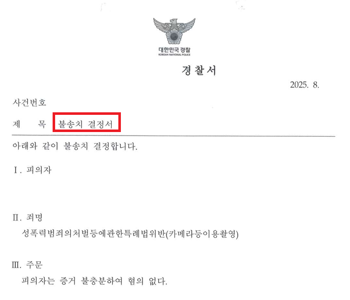 5. A씨는 카메라촬영죄 사건에서 저희의 조력을 받음으로써 경찰단계에서 불송치 처분을 받으셨습니다.