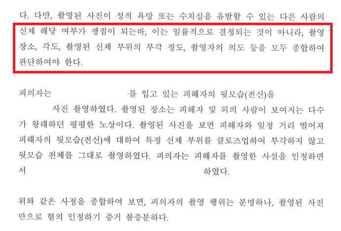 촬영 사실을 인정하더라도, 그 장면이 성적 자기결정권을 침해하는 방식으로 해석될 여지가 있는지는 별도의 판단 구조에 따라 검토됩니다. 특정 신체 부위가 포착되지 않은 사진이나 이동 중 자연스럽게 촬영된 장면처럼 성적 목적이 단정되기 어려운 경우에는, 구성요건 판단에서 어떤 요소가 실제로 의미를 갖는지 명확하게 구분해두어야 합니다.