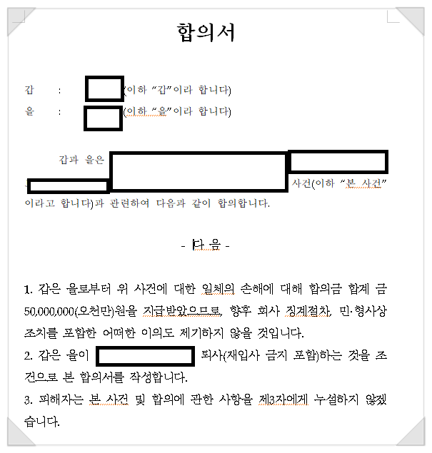 최종적으로는 피해자가 제안한 합의금 5천만원 및 가해자의 퇴사를 조건으로 합의가