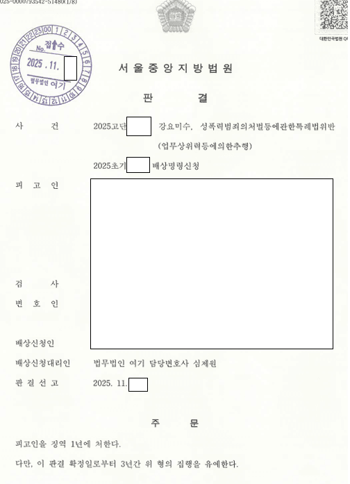 안녕하세요. 오늘은 제가 성범죄 피해자를 대리해서 가해자를 고소하고, 경찰서 조사에 함께 2회 참여를 했던 사건의 결과를 포스팅합니다. 다행히도 구공판이 되었고, 징역 1년, 집행유예 3년으로 전부 유죄가 선고되었습니다. 실형이 안나와서 조금 아쉽기도 한데, 항소심에서 또 형이 올라가길 바랍니다.