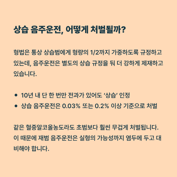 많은 분들이 “두 번 반복해야 상습 아닌가요?”라고 생각하시지만, 10년 내 적발 이력 1회만 있어도 상습 음주운전으로 간주합니다.