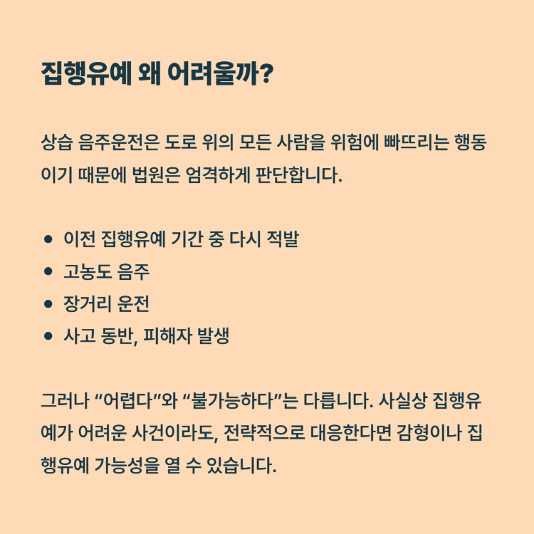 많은 분들이 이렇게 문의하시지만, 상습 음주운전은 집행유예가 쉽게 허용되지 않는 범죄입니다. 오히려 자칫하면 실형이 선고될 가능성이 매우 높습니다.