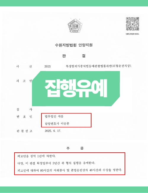 그 결과, 전과가 있음에도 불구하고 징역 1년, 집행유예 2년, 교육 이수 및 사회봉사라는 선처를 이끌어냈습니다.